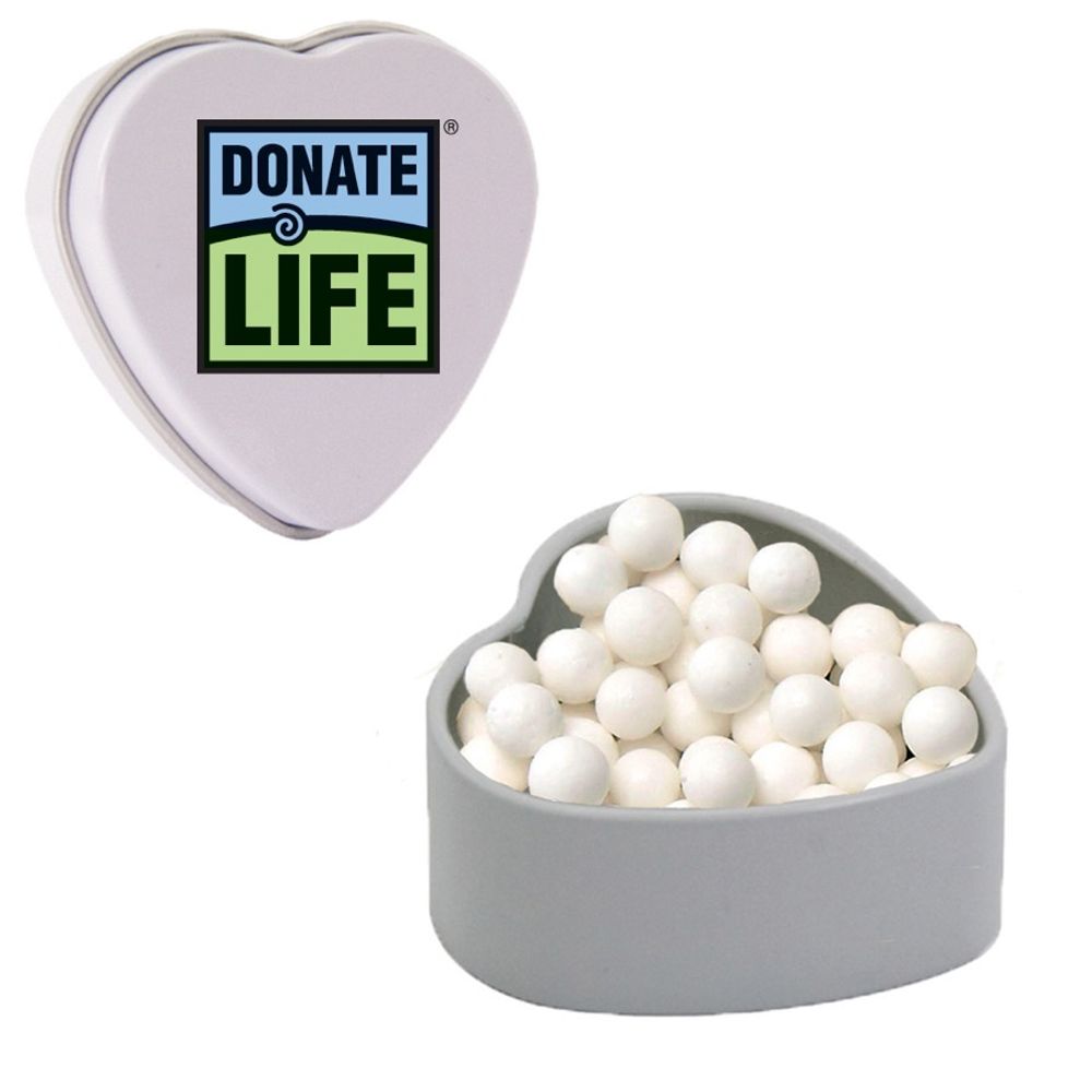 Heart shaped tin filled with peppermints is a great giveaway that can be reused once the mints are gone. 1 5/8" x 1 3/4" x 3/4"Please allow 3-4 weeks for production and shipping.